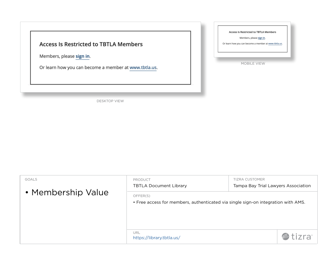 DESKTOP VIEW https://library.tbtla.us/ MOBILE VIEW GOALS Membership Value OFFER(S) Free access for members, authenticated via single sign-on integration with AMS. PRODUCT URL TIZRA CUSTOMER TBTLA Document Library Tampa Bay Trial Lawyers Association
