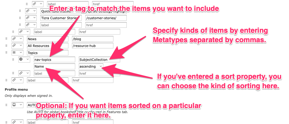 Next, fill in admin tags and meta-types. For example, if you wanted to list all of the Collections that have the tag nav-topics, you'd put "nav-topics" in the admin tag field and SubjectCollection in the meta-type field.