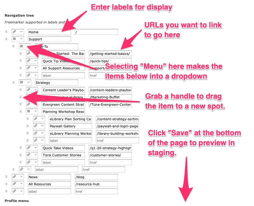 The layout of the builder gives an overview of the navigation structure, with submenus indented. To add new items, just type in a label and a URL as shown below. You can create dropdown menus by selecting Switch to menu on an item, then filling in the indented links below.
