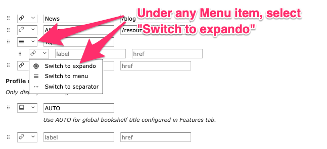 To create an Expando menu, start by creating a regular Menu item. Then in the item below it, select Switch to expando as shown below.