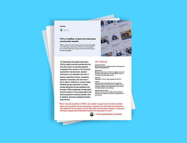 The Tampa Bay Trial Lawyers Association (TBTLA) exists to provide members with the tools they need to successfully represent consumers in the courtroom. The non-profit organization had abundant, valuable information at its disposal in the form of member-submitted motions, complaints, deposition transcripts, and much moreโ but no way for members to access it easily. Inefficiencies and limitations in content sharing diminished the user experience and the value of TBTLA membership. The association found its solution in a new search and discovery platform, resulting in greater value to members and some unexpected benefits along the way.