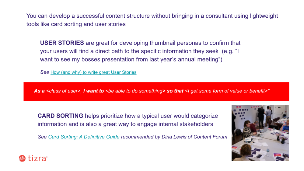 CARD SORTING helps prioritize how a typical user would categorize information and is also a great way to engage internal stakeholders See Card Sorting: A Definitive Guide recommended by Dina Lewis of Content Forum As a class of user, I want to be able to do something so that I get some form of value or benefit” You can develop a successful content structure without bringing in a consultant using lightweight tools like card sorting and user stories USER STORIES are great for developing thumbnail personas to confirm that your users will find a direct path to the specific information they seek (e.g. “I want to see my bosses presentation from last year’s annual meeting”) See How (and why) to write great User Stories